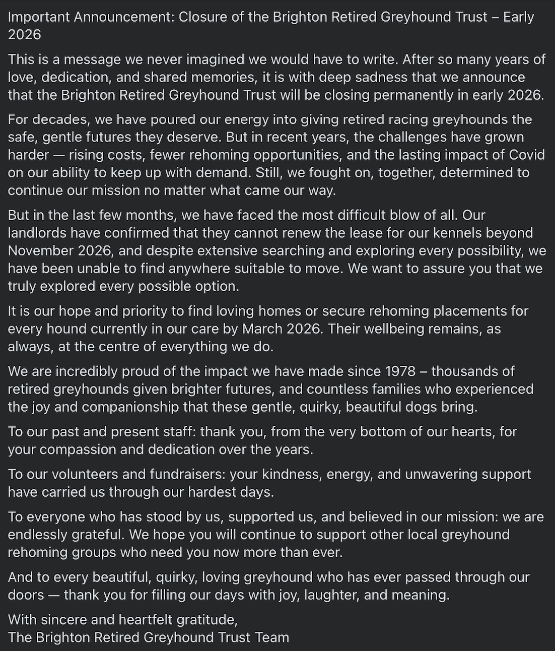 Founded in 1978 The Brighton Retired Greyhound Trust is a registered, independent charity. We work alongside the National RGT and other local welfare organisations to ensure as many greyhounds as possible have a happy retirement..Read More